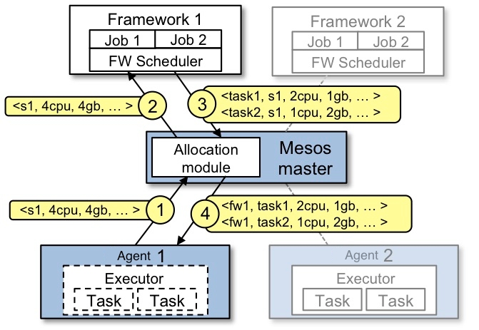 1.Agent 1 reports to the master that it has 4 CPUs and 4 GB of memory free. The master then invokes the allocation policy module, which tells it that framework 1 should be offered all available resources. 2.The master sends a resource offer describing what is available on agent 1 to framework 1. 3.The framework’s scheduler replies to the master with information about two tasks to run on the agent, using for the first task, and for the second task. 4.Finally, the master sends the tasks to the agent, which allocates appropriate resources to the framework’s executor, which in turn launches the two tasks (depicted with dotted-line borders in the figure). Because 1 CPU and 1 GB of RAM are still unallocated, the allocation module may now offer them to framework 2.